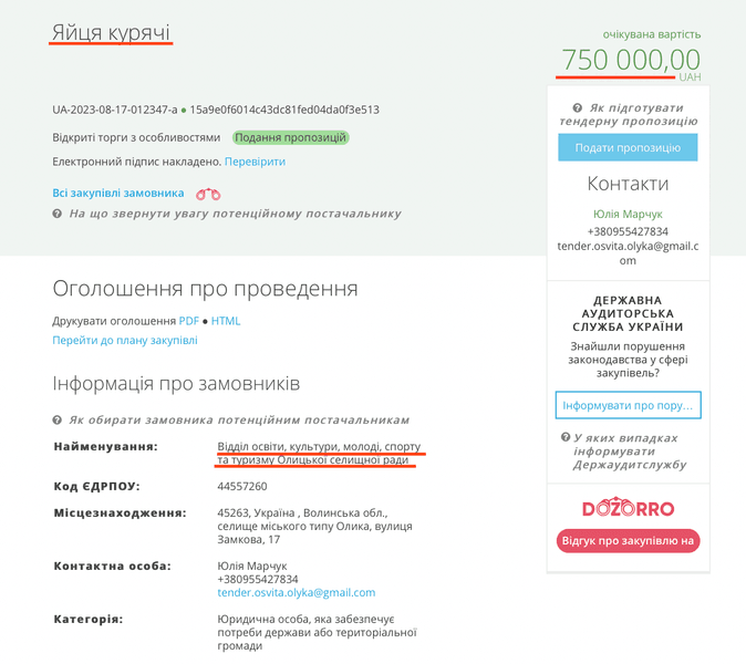 Отдел образования, культуры, молодежи, спорта и туризма Олыцкого поселкового совета объявил открытые торги на куриные яйца с ожидаемой стоимостью в размере 750 тысяч гривен. Речь идет о 15 тысячах яиц, то есть стоимость одного оценили в 50 гривен.