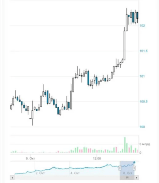 По состоянию на 9 октября, как свидетельствуют данные Мосбиржи, стоимость одного доллара на бирже превысила 102 рубля. А евро поднялся до отметки в 107-108 рублей.
