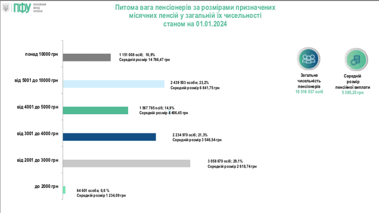 По состоянию на 1 января 2024 года в Украине насчитывается 10,5 миллиона пенсионеров, а средняя пенсия составляет чуть более 5385 гривен.