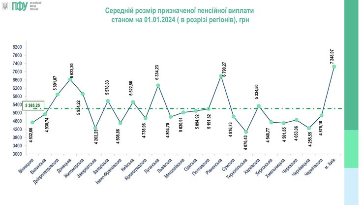 Среди регионов лидерство по размеру средней пенсии по состоянию на 1 января 2024 года принадлежит Киеву — 7249 гривен.