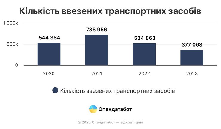Статистика за 2023 год свидетельствует о том, что в Украину было импортировано 377 063 транспортных средства. Это самый низкий показатель за последние три года. Об этом сообщает сервис мониторинга регистрационных данных "Опендатабот".