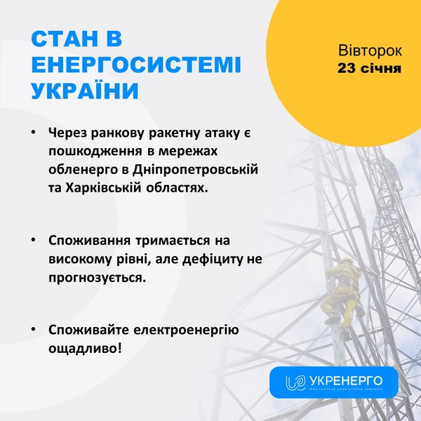 Из-за утренней ракетной атаки РФ по территории Украины утром, 23 января, есть повреждения в сетях облэнерго в Днепропетровской и Харьковской областях. Об этом сообщает "Укрэнерго".