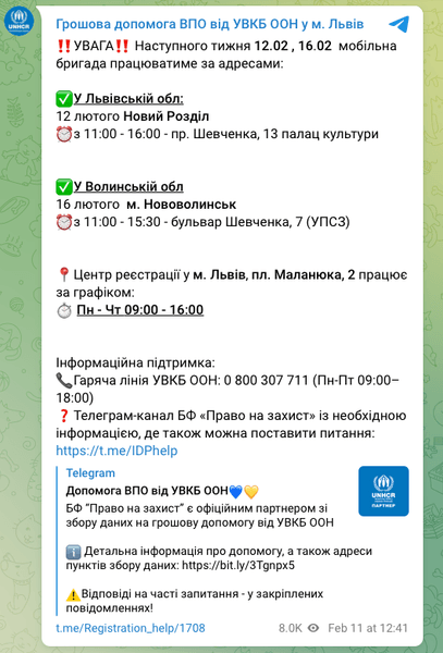 Управление верховного комиссара по делам беженцев (УВКБ) ООН собирает данные для оказания финансовой помощи внутренне перемещенным лицам (ВПЛ), проживающим во Львовской и Волынской областях. Об этом сообщает управление в официальном телеграм-канале.