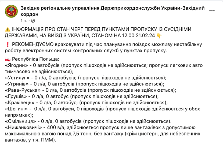 Относительно выезда из Украины — информация представлена Западным региональным управлением ГПСУ по состоянию на 12:00 21 февраля.