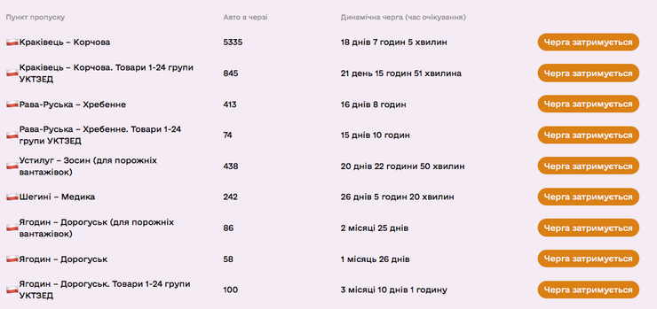 Въезд в Украину также блокируется протестующими и согласно информации на сайте "єЧерга" актуальное состояние на 17:50 11 марта выглядит так.