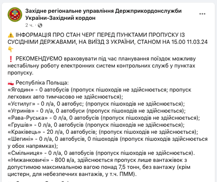 Осложнение движения для грузовиков на украино-польской границе продолжается. Актуальное состояние выезда транспорта из Украины на 15:00 11 марта выглядит так, как на скрине.