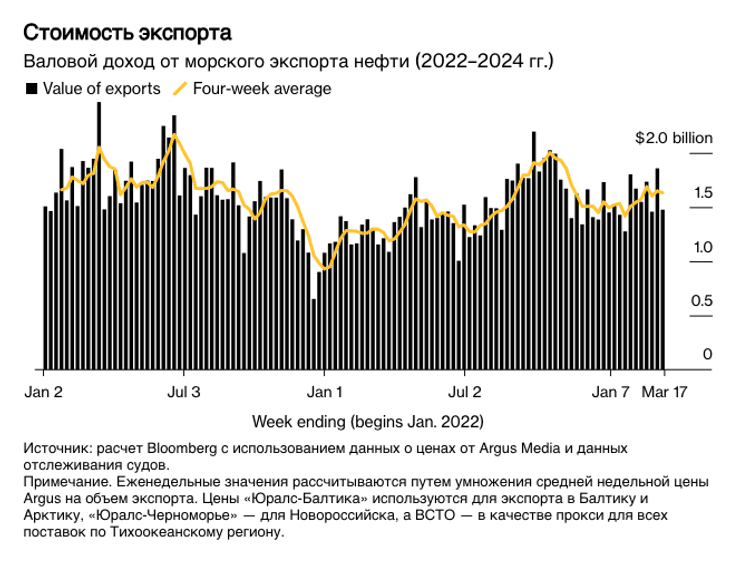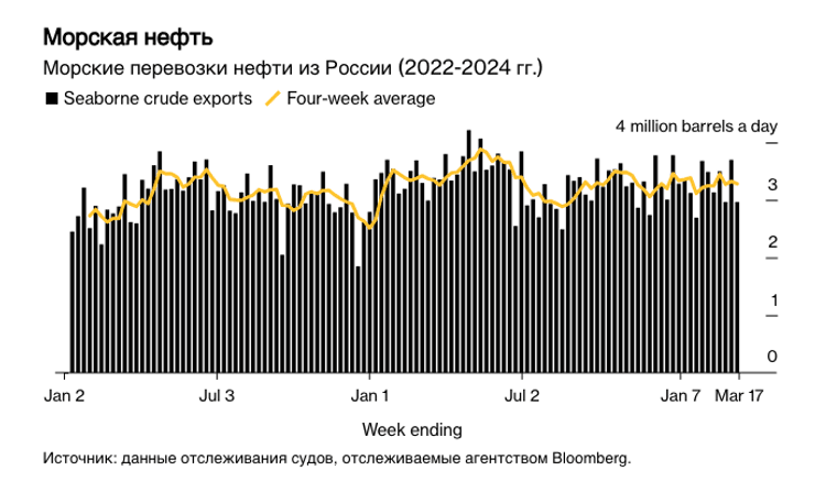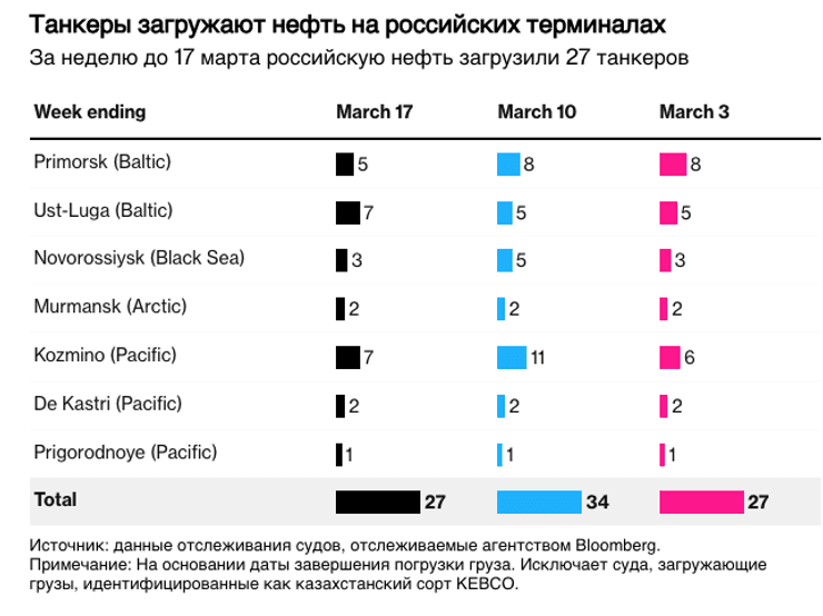 Всего за неделю, закончившуюся 17 марта, 27 танкеров загрузили 20,8 млн баррелей российской нефти, свидетельствуют данные отслеживания судов и отчеты портовых агентов. Это примерно на 5,1 миллиона баррелей меньше, чем на предыдущей неделе.