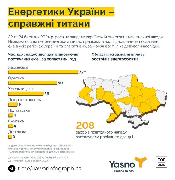 При составлении инфографики учитывали информацию, предоставленную главами ОВА, ДТЭК, Воздушными силами ВСУ. Данные указаны по состоянию на 26 марта 2024 года.