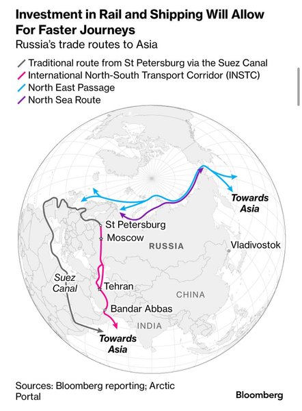 Как считают эксперты, развитие новых транспортных коридоров РФ свидетельствует об усилении разворота Москвы в сторону крупных азиатских государств — Китая и Индии, а также о намерении Кремля стать центром международной торговли.
