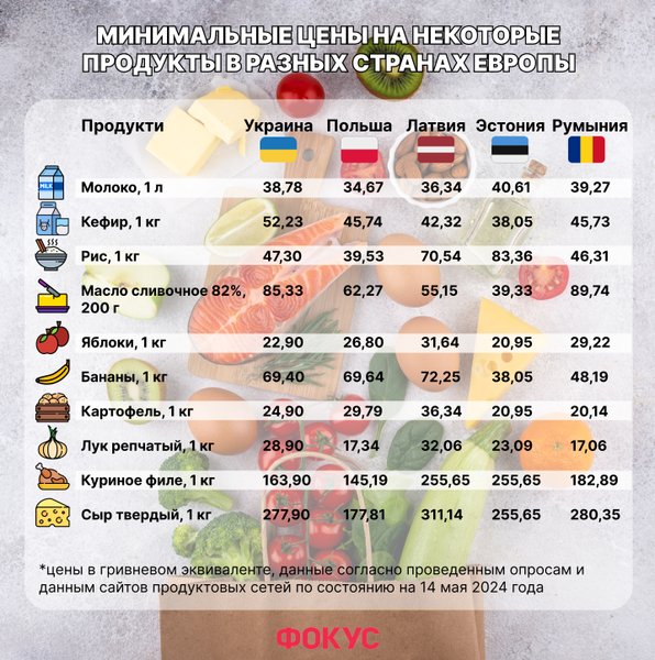 Для сравнения с ценами в Украине Фокус взял четыре европейские страны — соседние Польшу и Румынию, а также две страны Балтии — Латвию и Эстонию. Мы намеренно не выбрали для сравнения самые богатые страны Европы, ведь понятно, что при минимальной зарплате в 2500 евро, цены в супермаркетах там будут соответствующими.