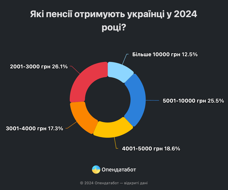 Тогда как большинство пенсионеров получают выплаты ниже 3 тысяч гривен. Но доля тех, кто имеет менее 4 тысяч гривен, сократилась с 51% до 43,5% за первое полугодие 2024 года. Среднюю пенсию в более 10 тысяч гривен выплачивают 1,2 миллиона украинцев.