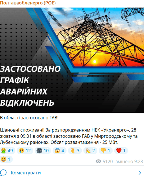 "По распоряжению НЭК "Укрэнерго", 28 октября с 09:01 в области применены ГАВ в Миргородском и Лубенском районах. Объем разгрузки — 25 МВт", — отметили в ведомстве.