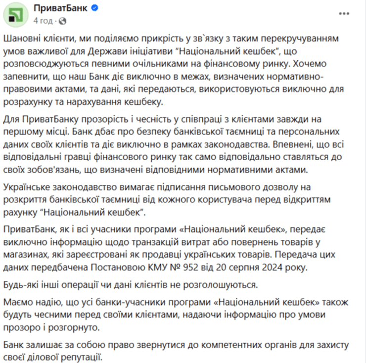 "ПриватБанк, как и все участники программы "Национальный кэшбек", передает исключительно информацию о транзакциях расходов или возвратов товаров в магазинах, которые зарегистрированы как продавцы украинских товаров. Передача этих данных предусмотрена Постановлением КМУ № 952 от 20 августа 2024 года. Любые другие операции или данные клиентов не разглашаются", — добавили в финансовом учреждении.