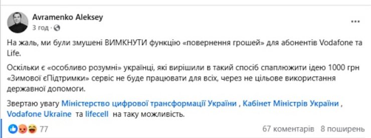 "К сожалению, мы были вынуждены отключить функцию "возврат денег" для абонентов Vodafone и Life. Поскольку есть "особо умные" украинцы, которые решили таким образом опорочить идею 1000 грн "Зимової єПідтримки", сервис не будет работать для всех, из-за не целевого использования государственной помощи", — написал он.