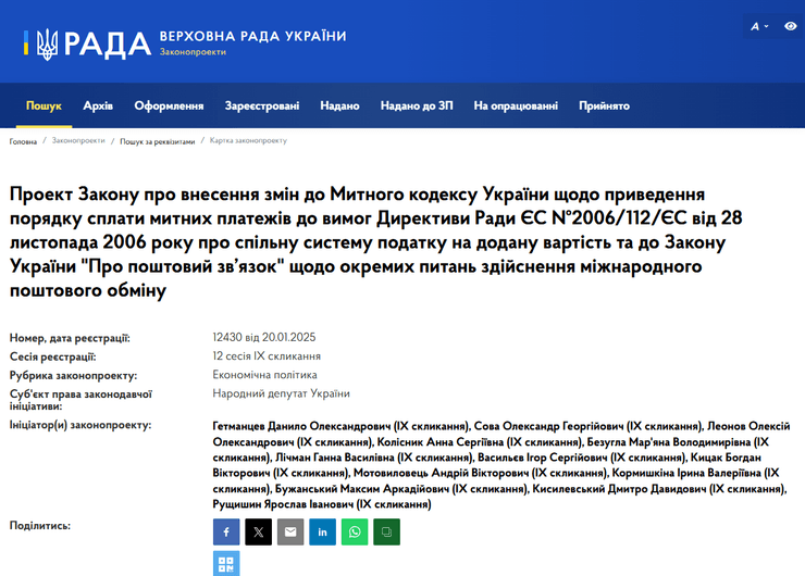 Текст проекта закона "О внесении изменений в Таможенный кодекс Украины относительно приведения порядка уплаты таможенных платежей к требованиям Директивы Совета ЕС №2006/112/ЕС от 28 ноября 2006 года о совместной системе налога на добавленную стоимость и в закон Украины "О почтовой связи" относительно отдельных вопросов осуществления международного почтового обмена" пока отсутствует.