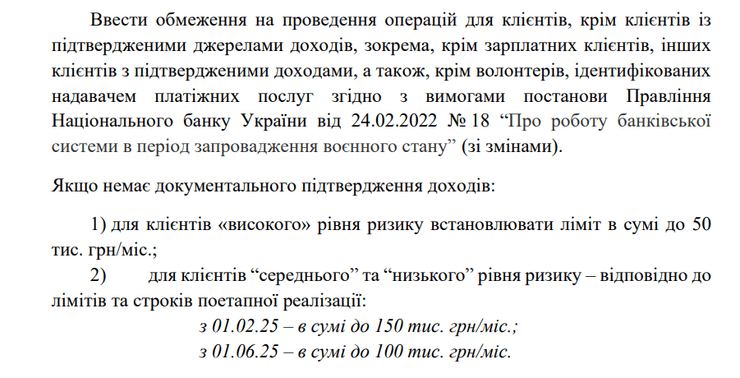 Клиентам, которые будут подпадать под "высокий" уровень риска, лимит составит 50 тысяч гривен в месяц.