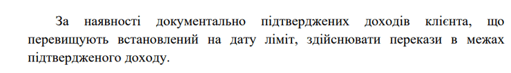 Согласно документу, для платежей по реквизитам IBAN месячный "порог" установлен в 150 тысяч гривен. Впрочем, это будет касаться только клиентов, которые не имеют документально подтвержденных доходов.