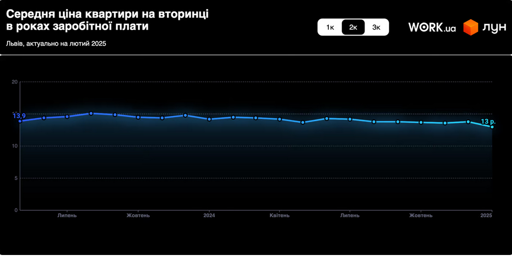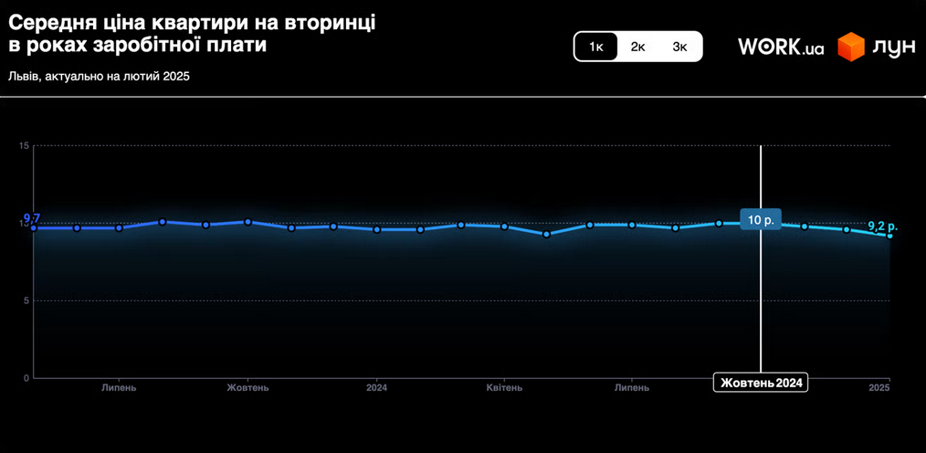 Во Львове ситуация аналогична киевской: также наблюдается постепенное снижение соотношения средней стоимости квартиры к средней зарплате. В феврале 2025 года для покупки однокомнатной квартиры потребуется 9,2 годовых зарплат, для двухкомнатной — 13 лет, а для трехкомнатной — 16,6 лет.