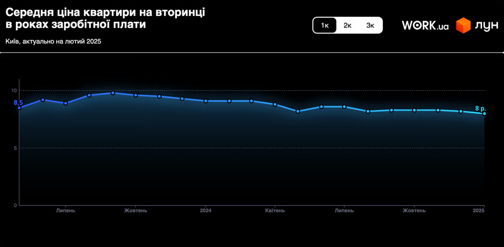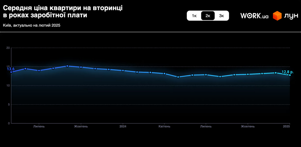 Безусловно, стоимость двух- и трехкомнатных квартир в Киеве выше. Для приобретения двухкомнатного жилья потребуется эквивалент 12,8 годовых зарплат, а трехкомнатного — 18,6 лет. Однако важно отметить, что эти показатели также демонстрируют тенденцию к снижению.