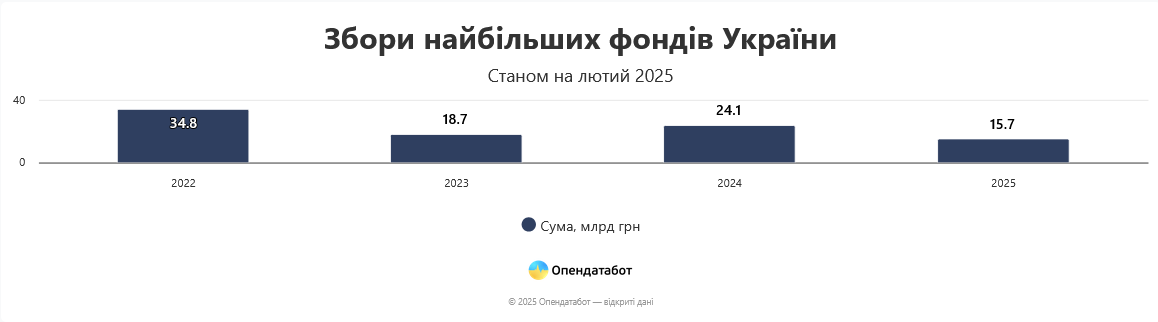В начале 2025 года благотворительные организации Украины уже собрали почти такую же сумму пожертвований, как за весь 2023 год — 15,7 миллиарда гривен против 18,7 миллиарда гривен. В 2024 году три крупнейших фонда страны смогли собрать 24,1 миллиарда гривен, что на 28% больше по сравнению с 2023 годом. Об этом сообщает Опендатабот.