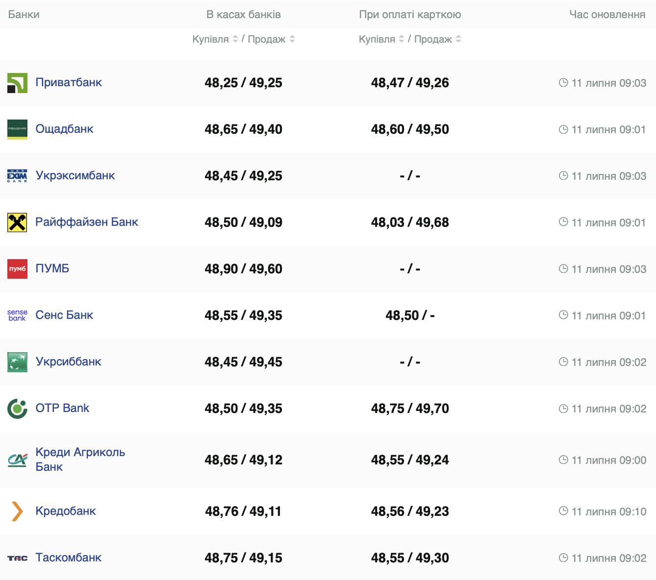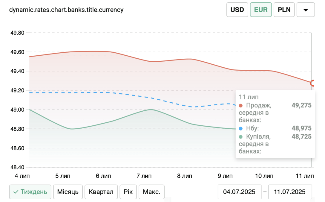 Курс валют на 11 июля: евро почти по 50 грн