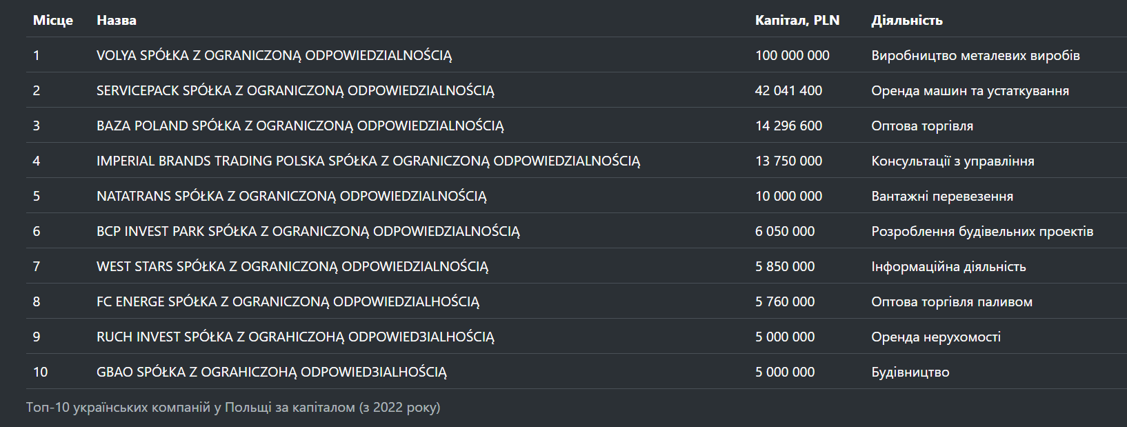 Какой капитал у большинства украинских компаний в Польше