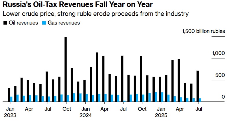 Налоги, связанные с нефтью, снизились почти на 33% до 710,4 млрд рублей, а совокупные доходы от продажи нефти и газа составили 787,3 млрд рублей, снизившись на 27%, сообщает Bloomberg со ссылкой на данные Минфина РФ.