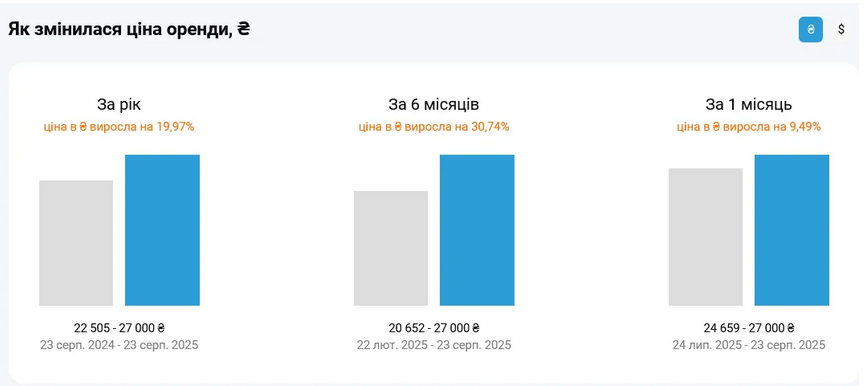 Средняя цена аренды поднялась с 20 652 до 27 000 гривен. При этом только за последний месяц рост составил 9,5% — почти 2,4 тысячи гривен. Об этом сообщает портал M2bomber.