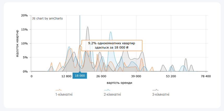 По данным аналитиков, стоимость аренды также зависит от количества комнат. Чаще всего однокомнатные квартиры предлагают за 18 000 грн. Двухкомнатные обходятся в среднем в 29 400 грн, а трехкомнатные — около 20 800 грн.