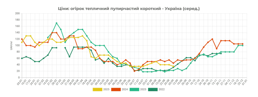 К концу первой недели сентября средние цены на тепличные огурцы упали на 16% и колебались в пределах 20–40 грн за килограмм ($0,48–0,97/кг).