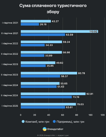 Местные бюджеты Украины за первое полугодие 2025 года получили рекордные 142,6 млн грн от туристического сбора — на треть больше, чем за аналогичный период 2024-го.