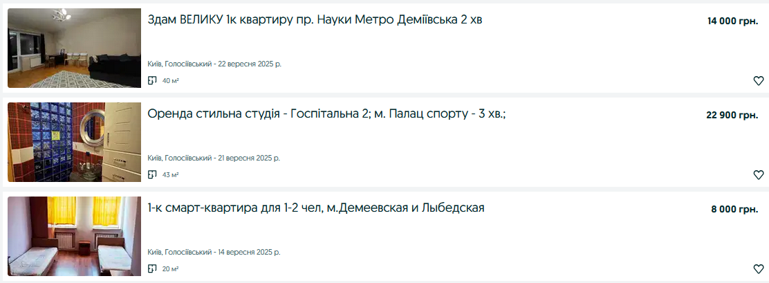 В среднем однокомнатная квартира в Голосеевском районе обходится в 10–26 тысяч гривен, при этом на стоимость влияют состояние жилья и удаленность от ключевых объектов.