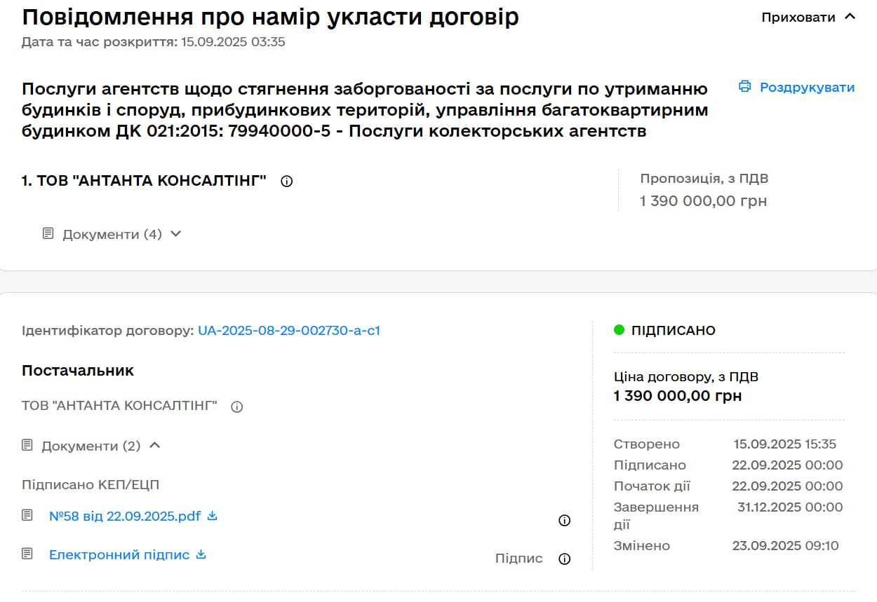 Согласно данным из системы Prozorro, договор о предоставлении коллекторских услуг был подписан 22 сентября 2025 года, но уже на следующий день в документы внесли изменения.