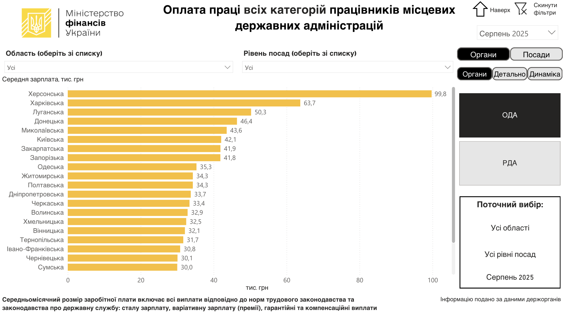 Однако самый заметный отрыв содержится в другой статистике — по уровню зарплат в областных администрациях. По оплате труда всех "конкурентов" опередила Херсонская ОГА, где средняя зарплата для всех должностей составляет 99,8 тысячи, а для руководства — 257,4 тысячи гривен.