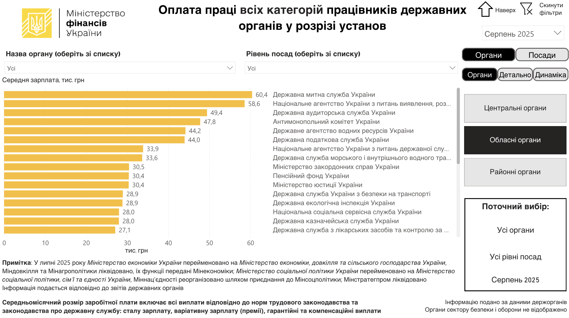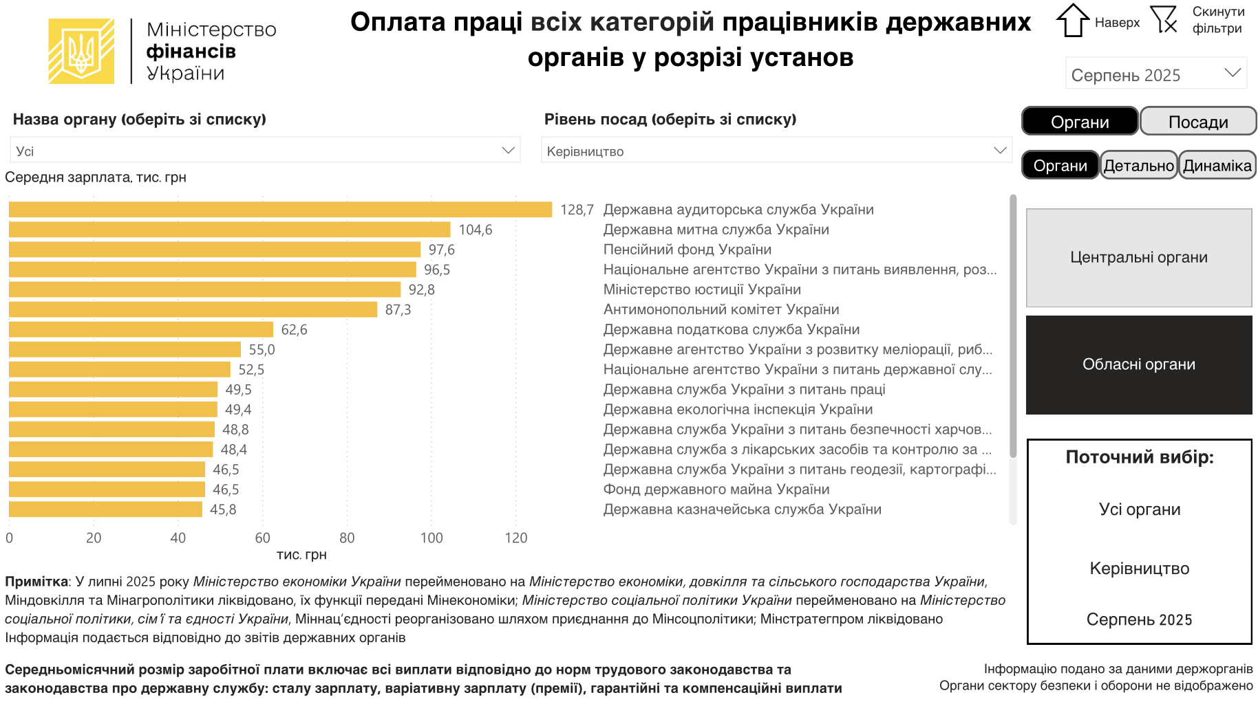 Статистика областных органов отличается, в частности по зарплате руководства со значительным отрывом вырвалась вперед Государственная аудиторская служба Украины, где в среднем платят 128,7 тысячи гривен.