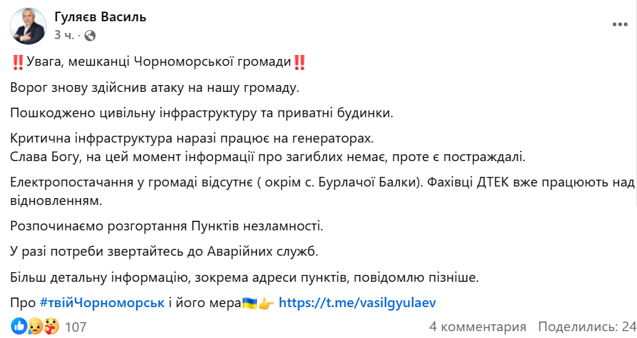 По информации городского головы Черноморска Василия Гуляева, пока нет данных о погибших, однако зафиксированы пострадавшие. Энергетики компании ДТЭК уже работают над восстановлением электроснабжения, за исключением села Бурлачья Балка, где подача электроэнергии сохраняется. В громаде разворачивают Пункты несокрушимости, где жители могут получить необходимую помощь. При необходимости гражданам советуют обращаться в аварийные службы. Подробная информация, в частности адреса пунктов, будет предоставлена дополнительно.