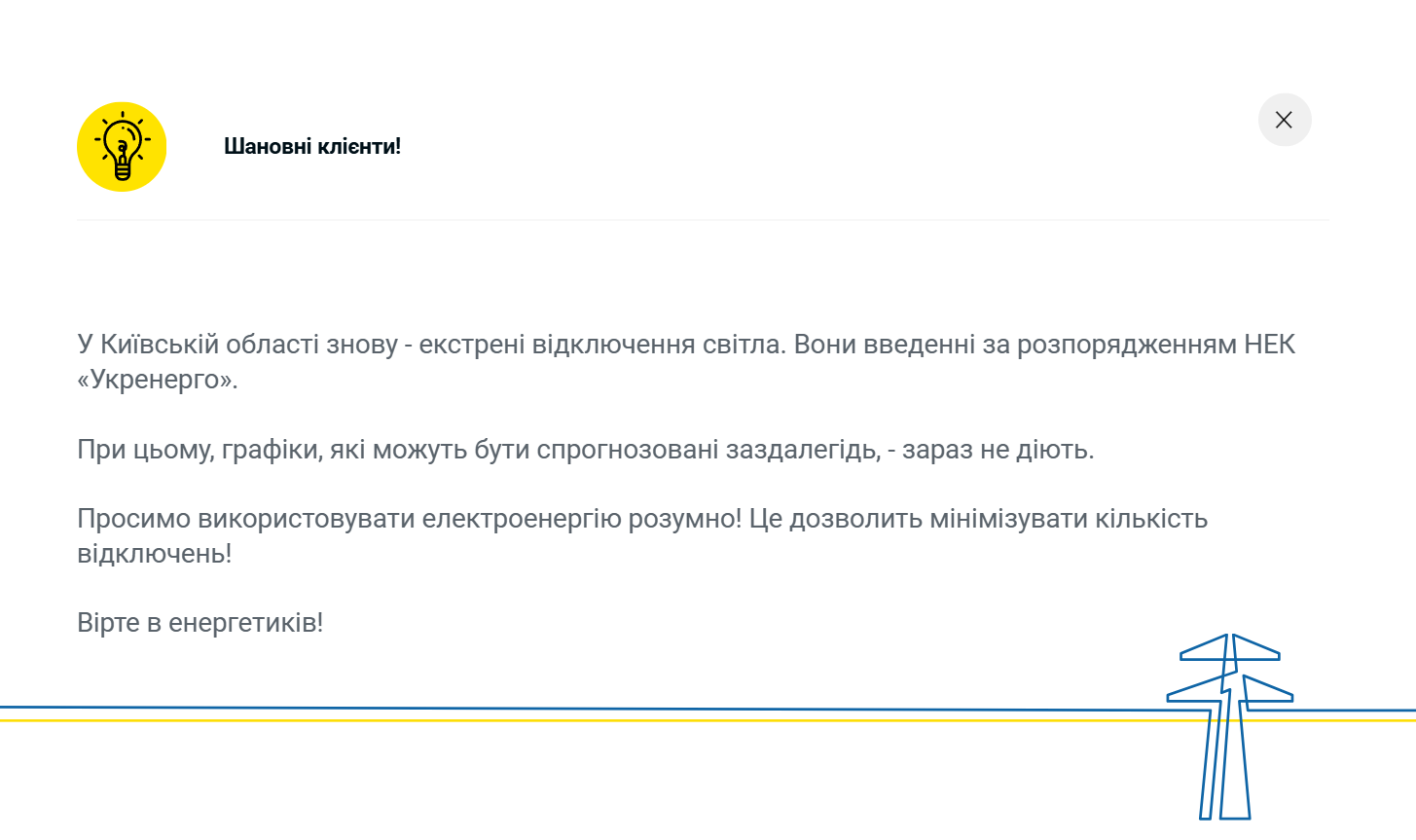Сообщение об экстренных отключениях света в Киевской области появилось на сайте ДТЭК. В компании отметили, что во время аварийных ограничений спрогнозированные заранее графики не действуют. Также по команде "Укренерго" были применены экстренные отключения света в самом Киеве.