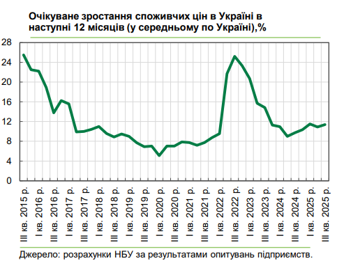 Инфляционные ожидания бизнеса ухудшаются уже второй квартал. Если во II квартале компании прогнозировали рост цен на 10,9%, то в III квартале ожидания поднялись до 11,4%. При этом в I квартале 2025 года инфляция ожидалась на уровне 11,5%, а в IV квартале 2024 года – 10,3%. Об этом говорится в результатах опроса, проведенного Национальным банком Украины.