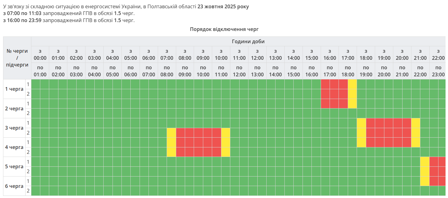 На Полтавщине график почасовых отключений введен в объеме 1.5 очередей с 07:00 по 11:03 и с 16:00 по 23:59. Актуальная информация размещена на сайте.