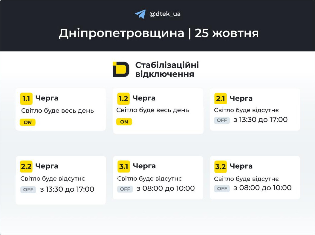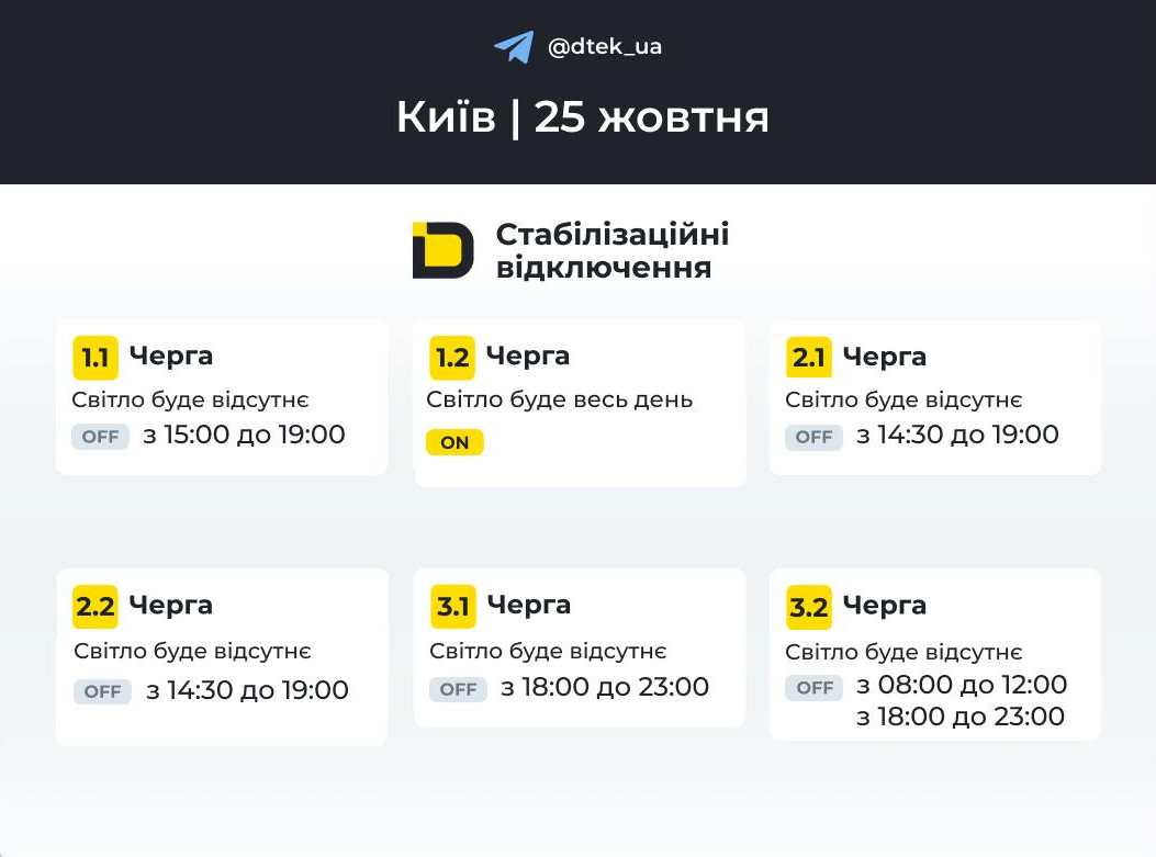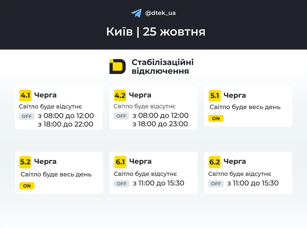 Единый официальный канал группы "ДТЭК" (@dtek_ua) обнародовал обновленные графики стабилизационных отключений для Киева, Киевской и Днепропетровской областей.