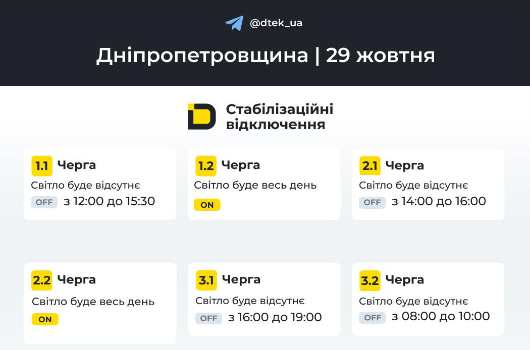 В нескольких регионах Украины 29 октября будут действовать стабилизационные графики отключения электроэнергии из-за последствий российских атак на энергетическую инфраструктуру. Больше всего ограничения коснутся Киева, Киевской и Днепропетровской областей.