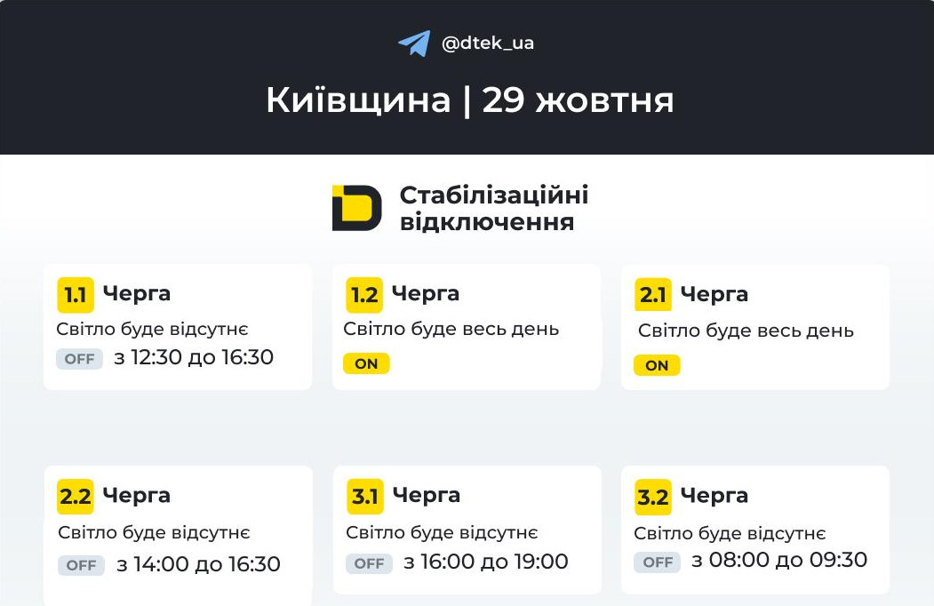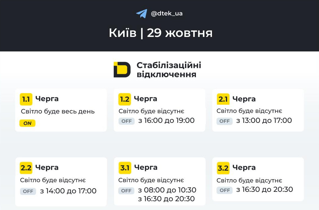 По информации официального канала группы ДТЭК, в столице 29 октября свет будет отключаться по очередям.