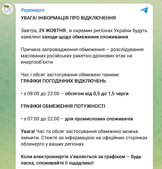 Как сообщила Национальная энергетическая компания "Укрэнерго", 29 октября в отдельных регионах страны будут применены меры по ограничению потребления электроэнергии.