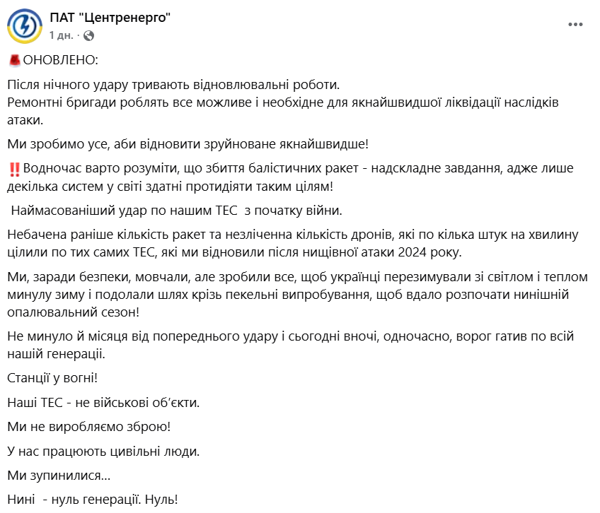 "После ночного удара продолжаются восстановительные работы. Ремонтные бригады делают все возможное и необходимое для скорейшей ликвидации последствий атаки. Мы сделаем все, чтобы восстановить разрушенное как можно быстрее!", — говорится в обновленной публикации "Центрэнерго".