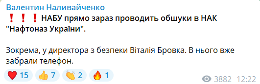 Как утверждают несколько нардепов, 19 ноября детективы НАБУ проводят следственные мероприятия в структурах НАК "Нафтогаз", а также пришли с обысками к новому директору по безопасности Группы "Нафтогаз" Виталию Бровко, который якобы пытался убежать от силовиков, но был задержан. Национальная компания, в свою очередь, опровергает информацию об обысках.