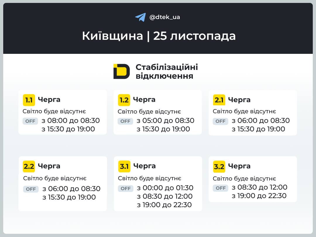 Графики отключений света на 25 ноября для 1-3 очередей в Киевской области