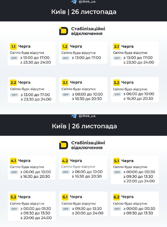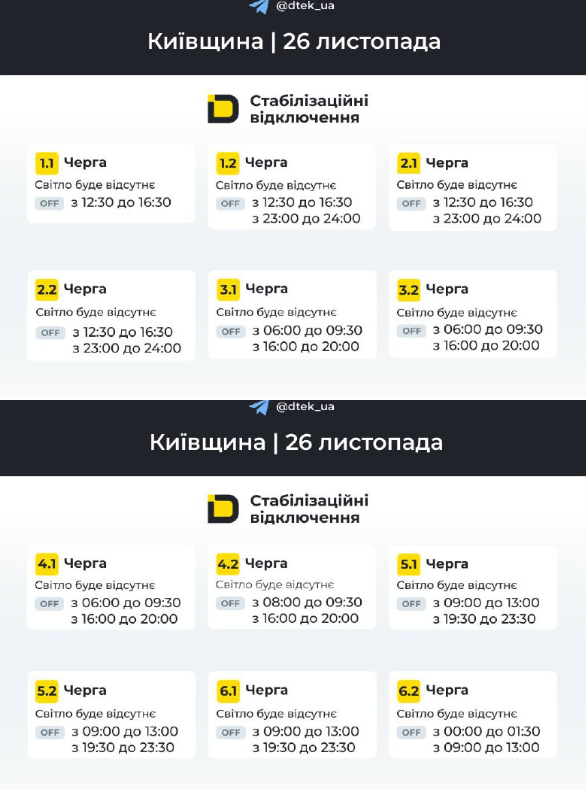 Информация об обновленных графиках отключения света 26 ноября опубликована на странице ДТЭК в Telegram. В Министерстве энергетики Украины в свою очередь сообщили об аварийных ограничениях энергоснабжения на Харьковщине, Сумщине и Полтавщине из-за российских атак на инфраструктуру.