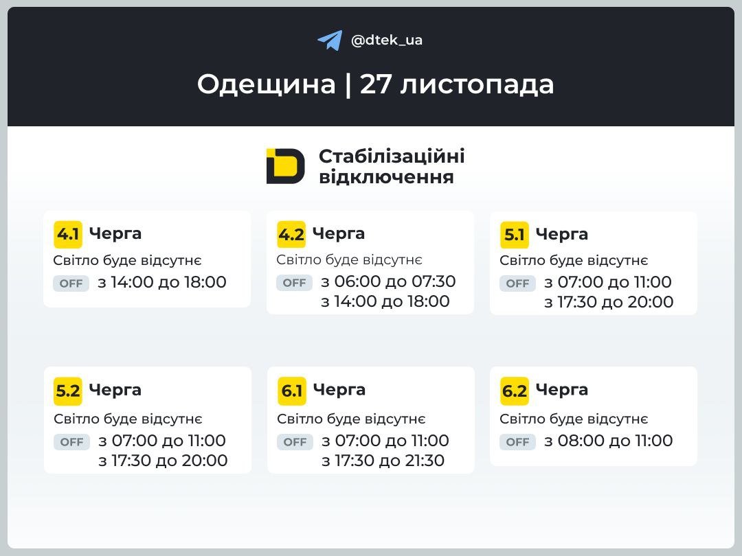 Графики отключений света на 27 ноября для 4-6 очередей в Одесской области