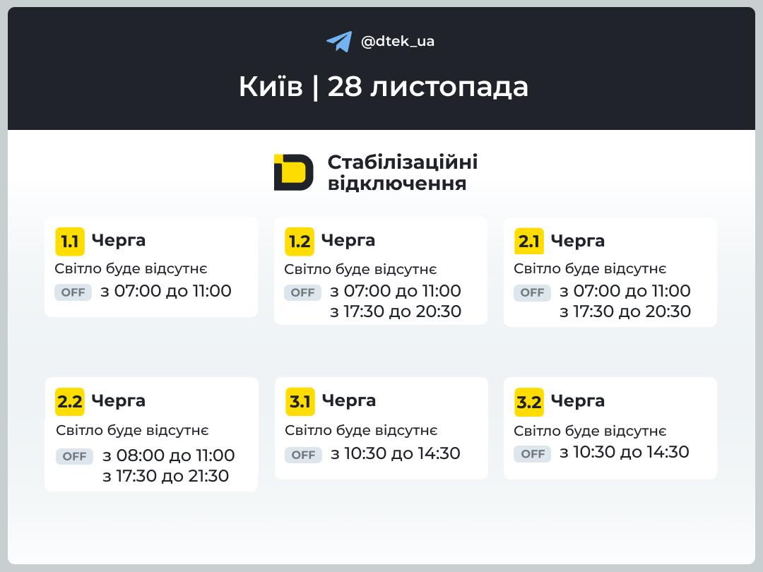 В пятницу, 28 ноября, во всех областях Украины продолжат действовать графики отключений света, вследствие массированных российских обстрелов объектов энергетики. ДТЭК опубликовал графики для трех областей и столицы.