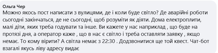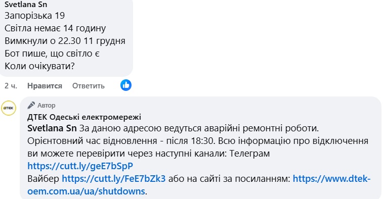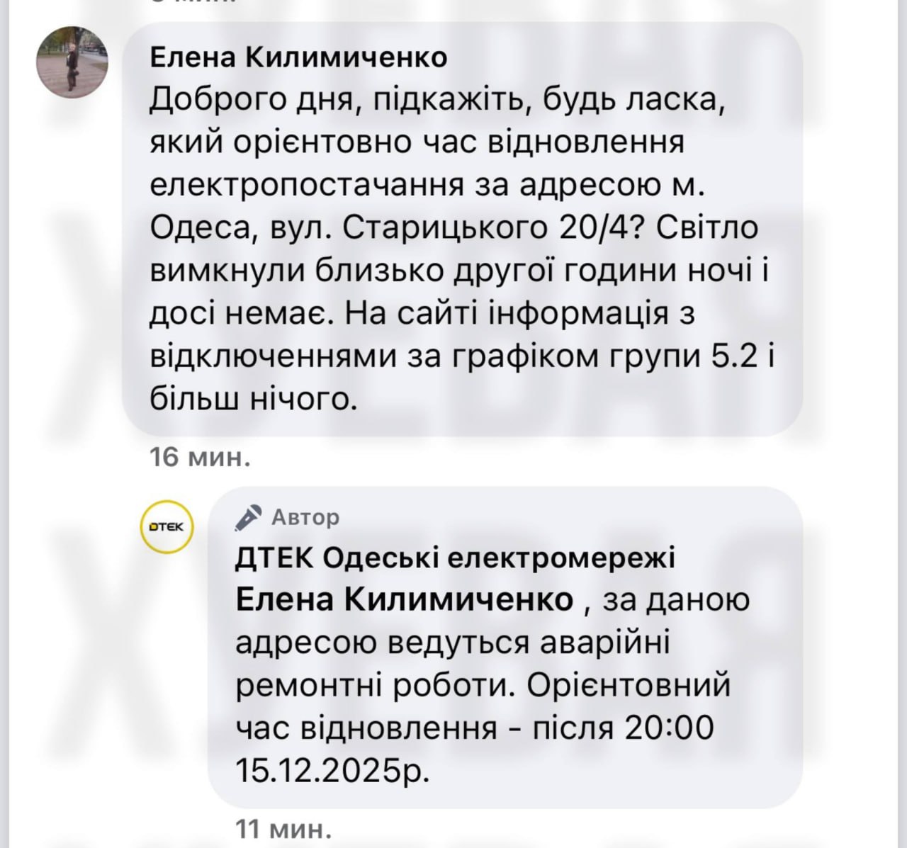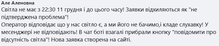 "Почему подключили дома рядом, а наш должен 4 суток ждать? Может быть, необходимо давать свет всем по очереди хотя бы по 6-8 часов в день, в особенности домам, где вся жизнедеятельность находится в зависимости от электроэнергии?", "Можно как-нибудь пост написать с улицами, где и когда будет свет? Где аварийные работы сегодня закончатся, где не сегодня, чтобы понимать, как действовать. Дома электроплиты, маленькие дети, которых нужно кормить и прочее… А света нет с 22:30. Дозвонится – еще тот квест", "Света нет с 22:30 11 декабря и по сей день! Заявки отклоняются как "не подтвержденная проблема"!" – жалуются одесситы.